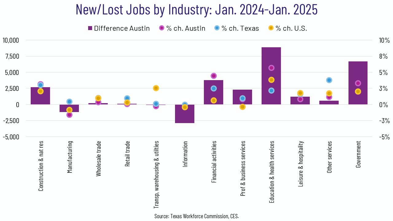 In addition to the benchmark revisions for 2024, we now have more job growth data. For the year ending in January, the Austin metro added 22,300 jobs (1.7% growth) with 14,100 private service-providing industries, 1,500 in private goods-producing industries, and 6,700 government jobs.