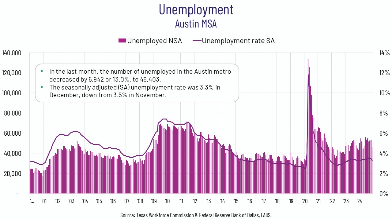 - Austin’s seasonally adjusted unemployment rate is 3.3% in December, down from 3.5% in November.