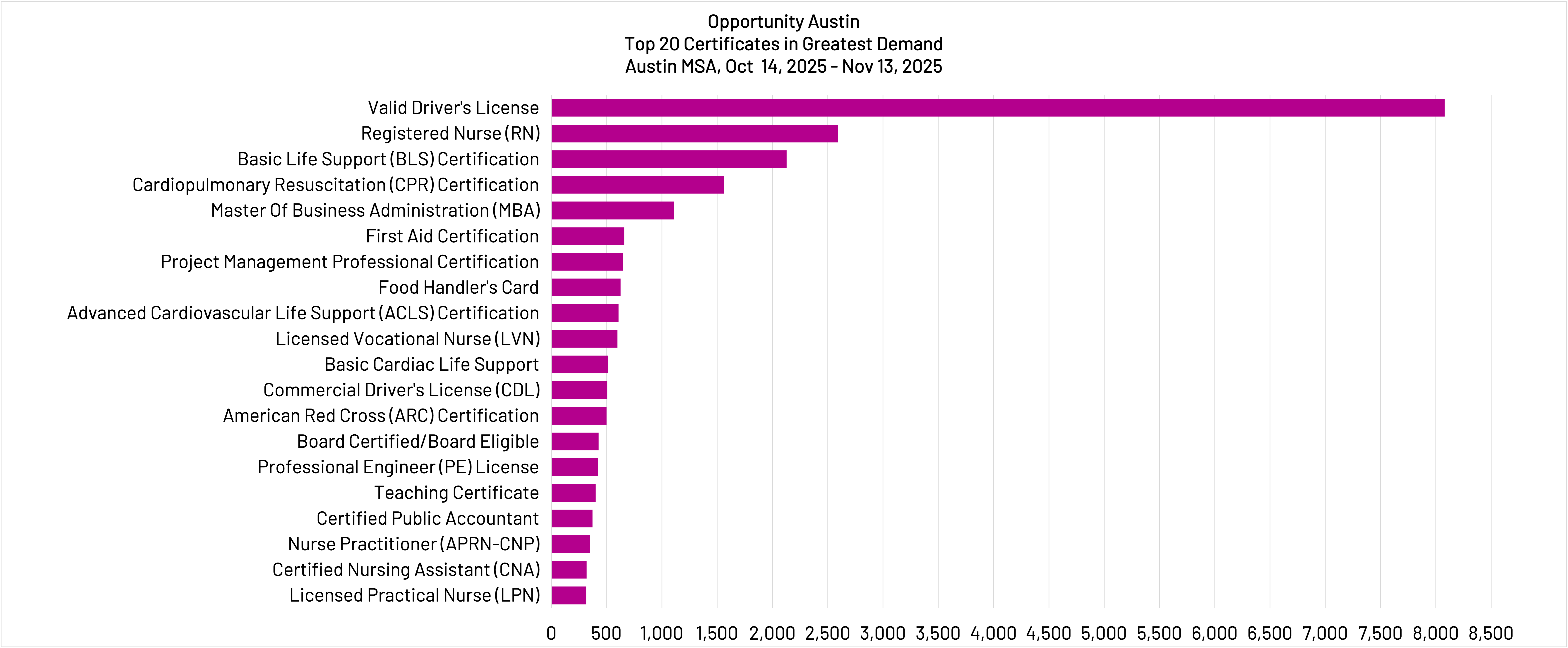 Twelve out of the top 20 in-demand certifications are healthcare-related, with the largest demand for registered nurses, basic life support, and cardiopulmonary resuscitation.