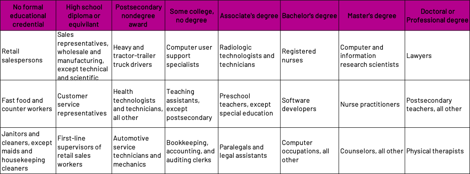 The table below lists the top three available job postings by typical entry-level educational requirement.