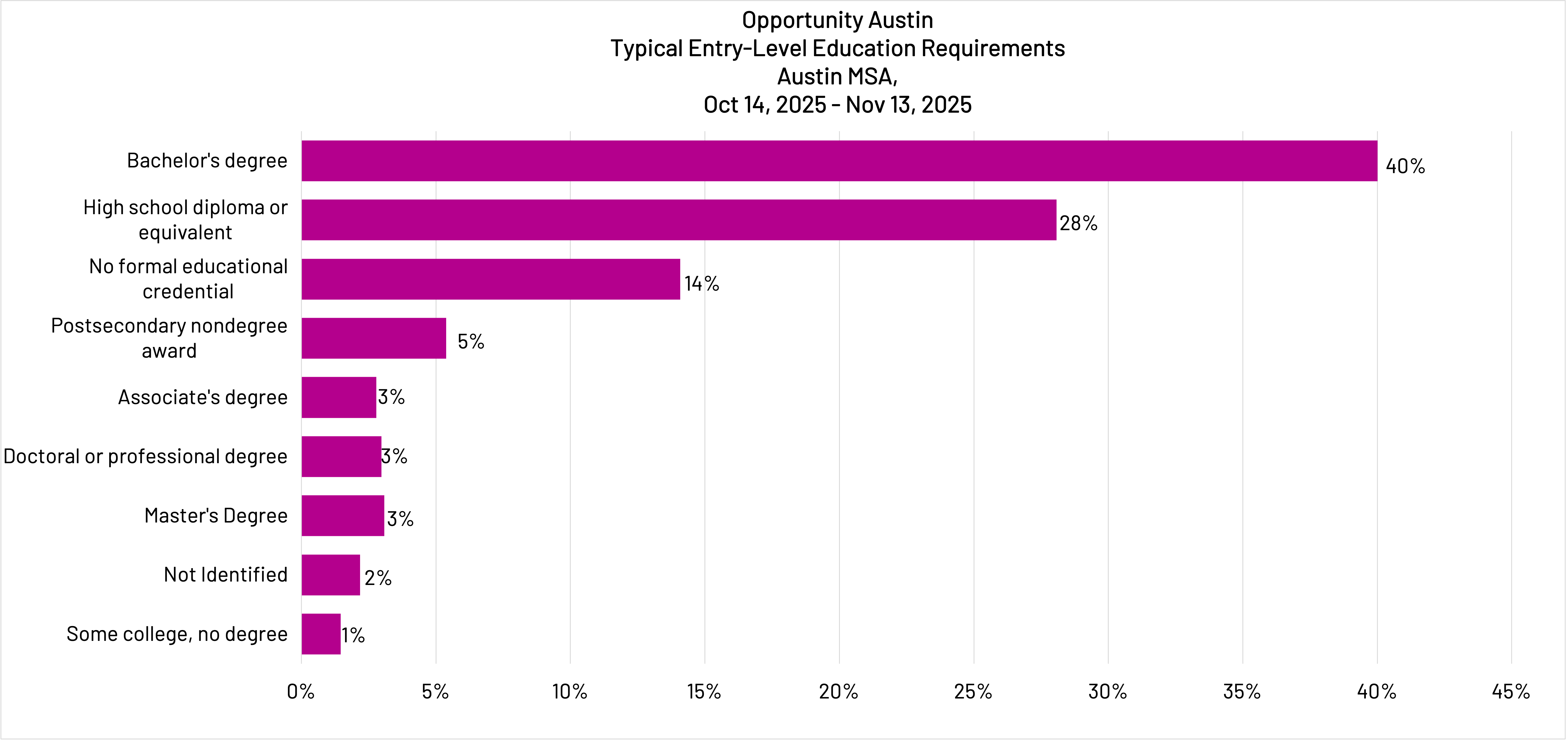 For all job postings in the Austin MSA, across occupations and industries, 56% require postsecondary education beyond high school as the typical entry-level education.
