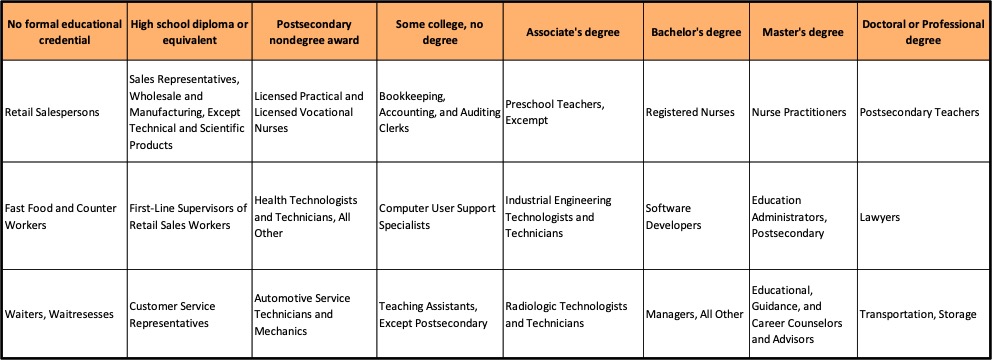 The table below represents the top 3 available job postings for each typical entry-level educational requirement.
