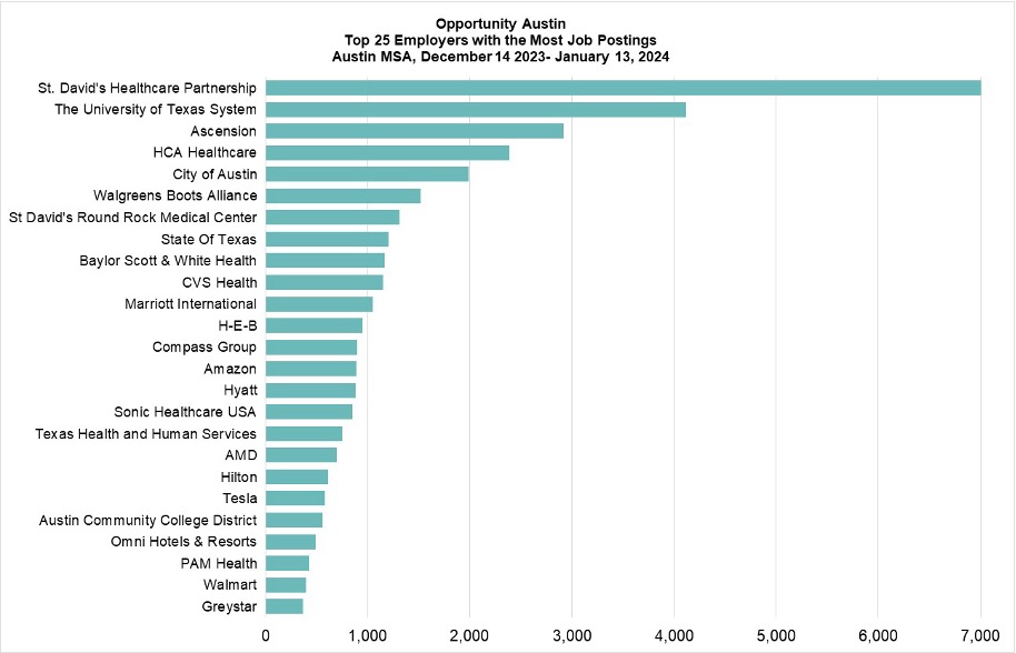 Top job postings for this period come from St. David’s Healthcare Partnership, The University of Texas System, and Ascension. Other top employers include HCA Healthcare and City of Austin.