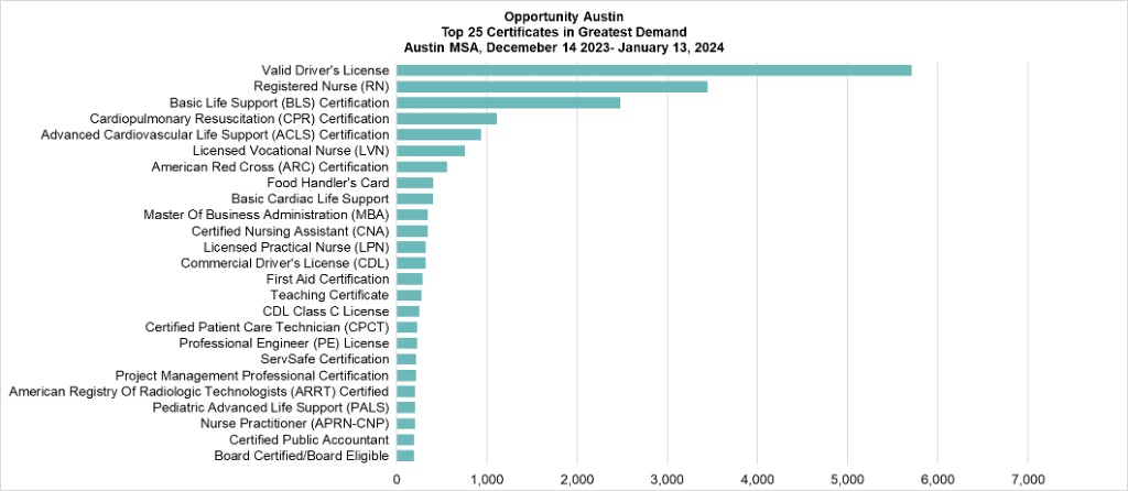 Fourteen out of the top 25 in-demand certifications are healthcare-related with the largest demand for registered nurses, basic life support, and cardiovascular and cardiopulmonary care.