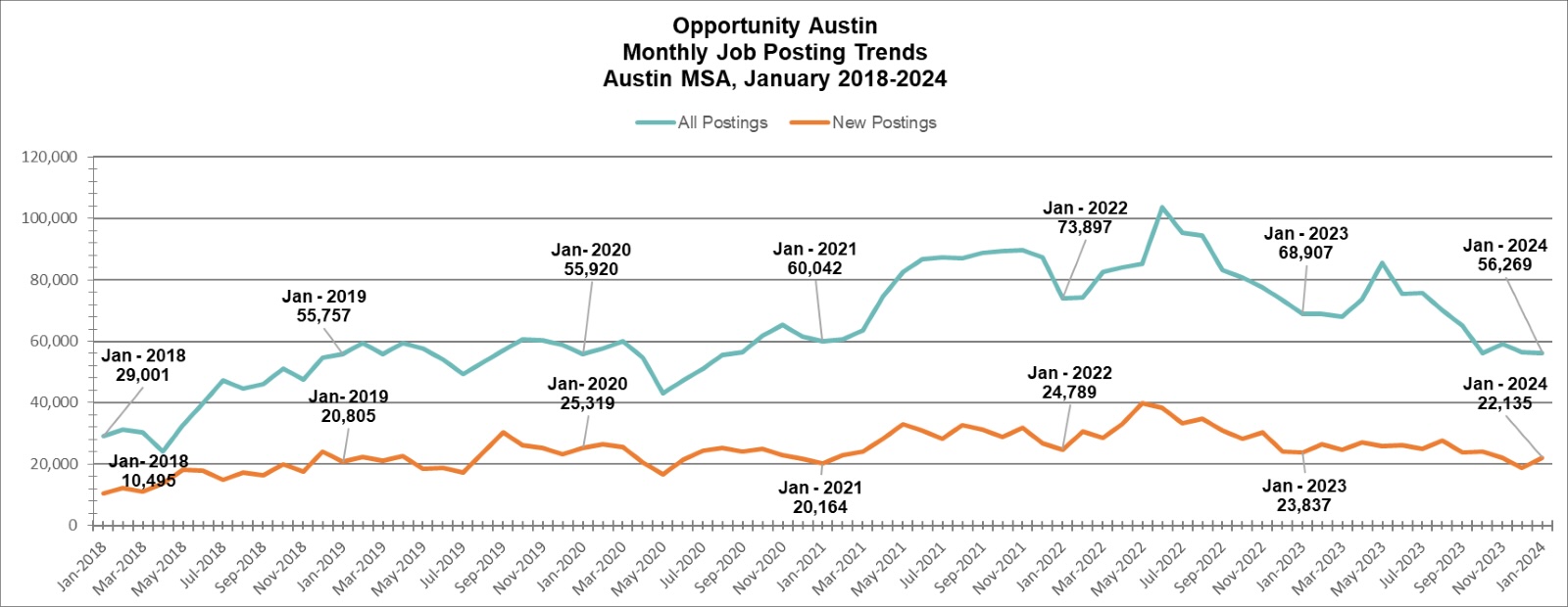 - Approximately 56,270 available jobs were posted during the January 2024 monthly reporting period, a decrease from 56,360 postings when compared to December 2023. There were 22,135 new postings, an increase of 3,364 first-time postings when compared to the previous month. New job postings in January 2024 represented 39% of all available job postings, 6% more than in December. New job postings increased by about 15% in the Austin and San Antonio metros and 22% increase in the Houston and Dallas metros compared to the prior month.