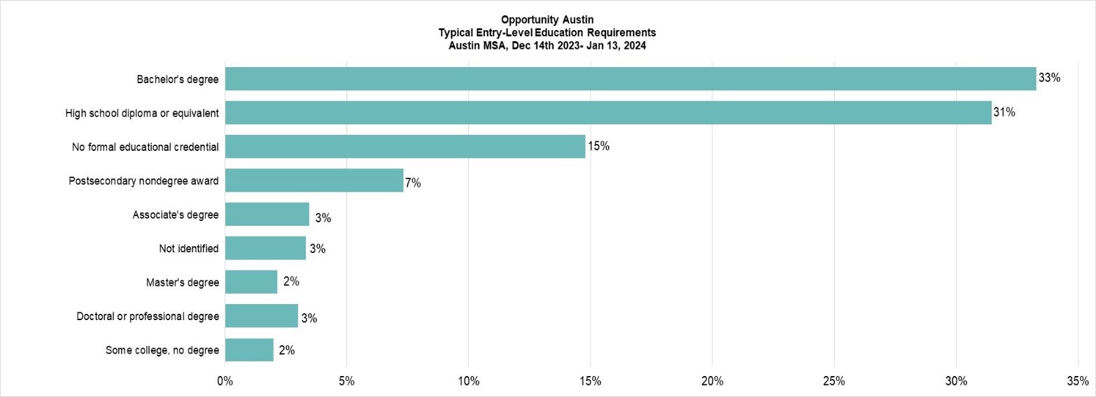 For all job postings in the Austin MSA across occupations and industries, 49% require postsecondary education beyond high school as the typical entry-level education.