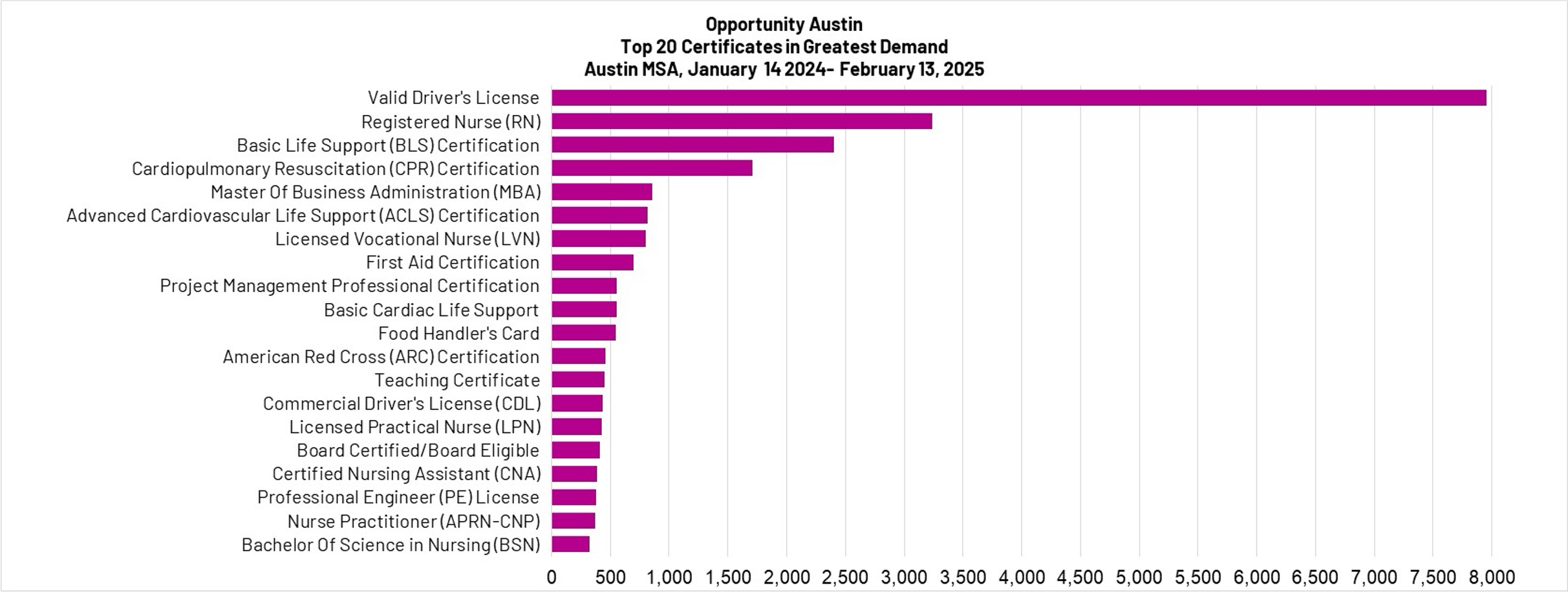 Twelve out of the top 20 in-demand certifications are healthcare-related with the largest demand for registered nurses, basic life support, and cardiopulmonary resuscitation.