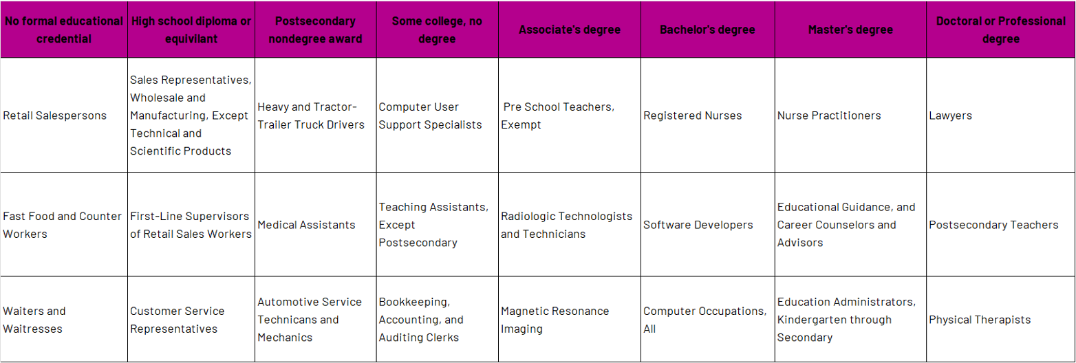 The table below lists the top three available job postings by typical entry-level educational requirements.