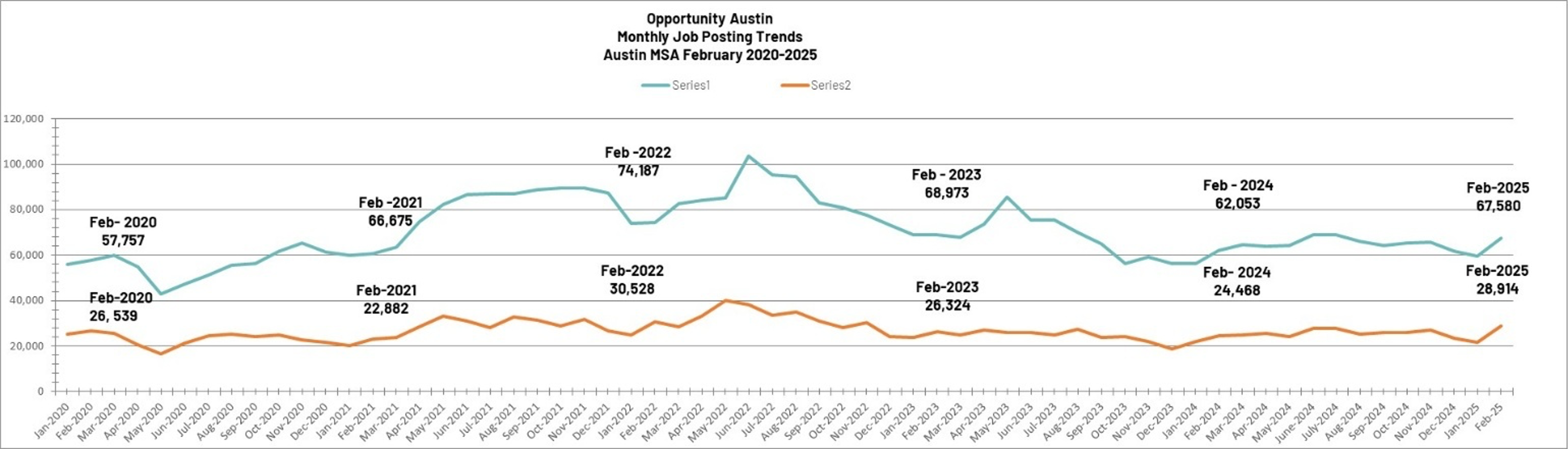 There were approximately 67,580 available job postings during the February 2025 reporting period, an increase of 7,963 from 59,617 postings in January 2025. There were 28,914 first-time job postings, an increase of 7,453 compared to the previous month. New job postings in February 2025 represented 42% of all available postings—an increase of 6 percentage points from January 2025. New job postings increased by 35% in the Austin and San Antonio metros and by 33% in the Houston and Dallas metros.