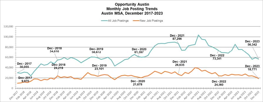 - There were approximately 56,360 available job postings during the December 2023 monthly reporting period, a decrease from 59,100 postings when compared to November 2023. There were 18,771 new (first-time) job postings, a decrease of 3,277 first-time postings when compared to the previous month. New job postings in December 2023 represented 33% of all available job postings, 4% less than in November. New job postings decreased by about 16 % in the Austin and San Antonio metros and 9% decrease in the Houston and Dallas metros compared to the prior month.