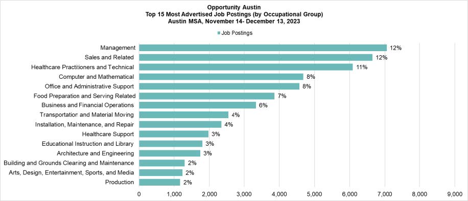 - Approximately 13% or 7,044 of all available job postings during the December 2023 reporting period fell under Management Occupations while 8,038 job postings fell under Healthcare Practitioners and Technical, showing continued strong demand for experienced and healthcare talent in our region.