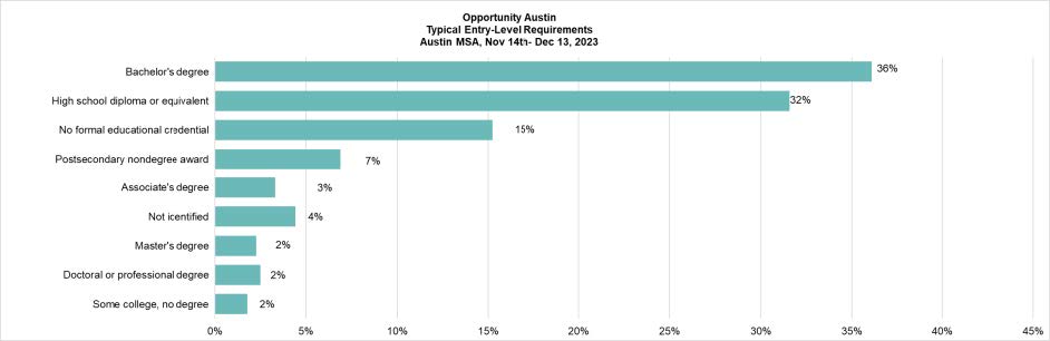 For all job postings in the Austin MSA across occupations and industries, 53% require postsecondary education beyond high school as the typical entry-level education.