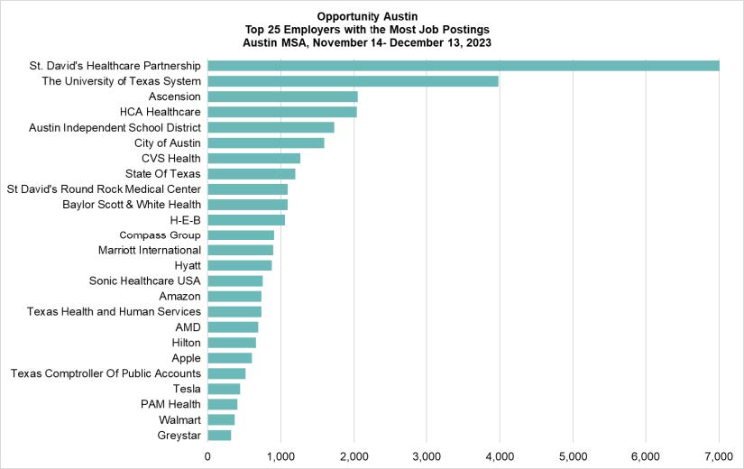 Top job posting employers, St. David’s Healthcare Partnership and The University of Texas System, drive demand for talent in healthcare and supporting occupations. Other top employers include Ascension, HCA Healthcare and Austin Independent School District.