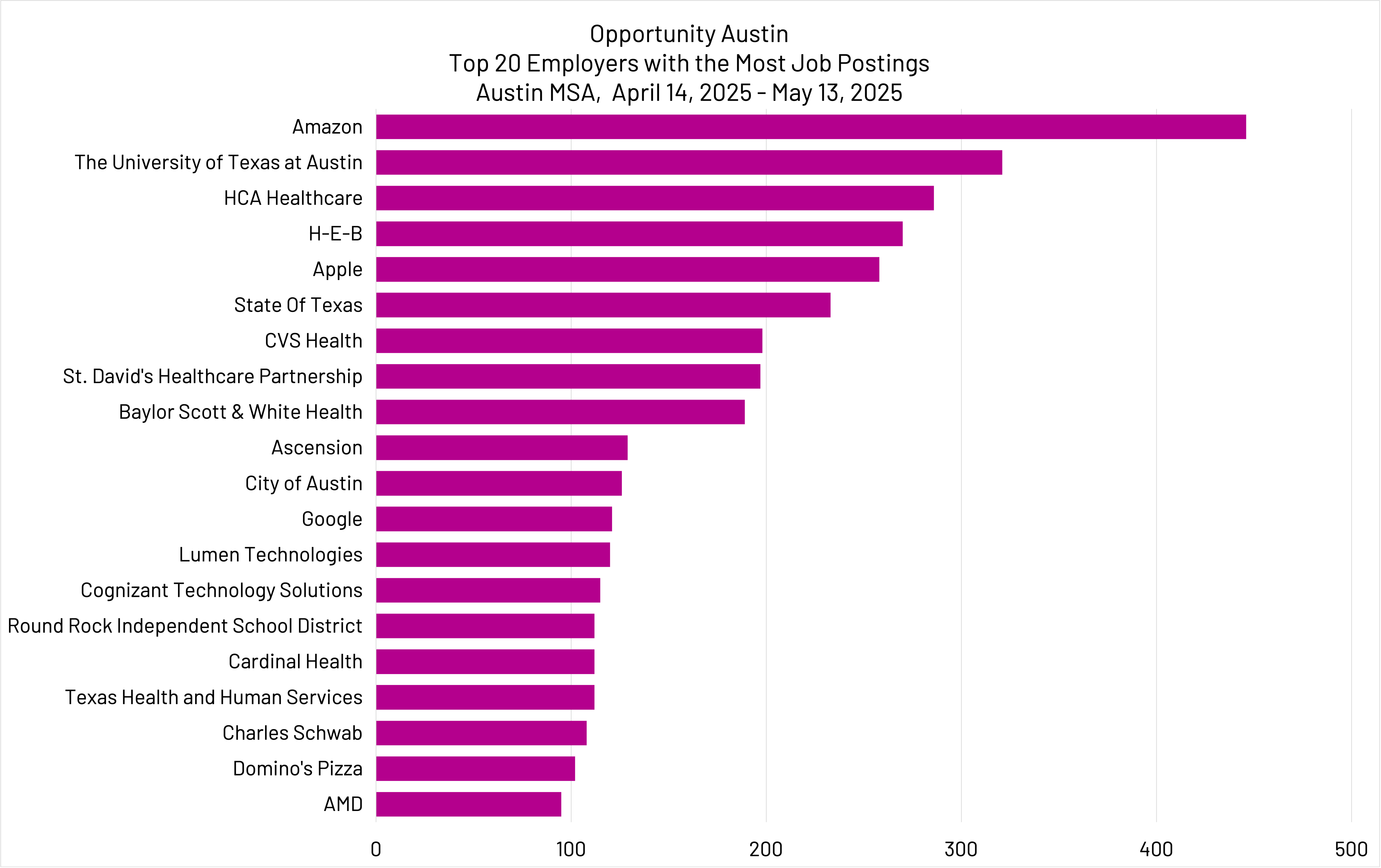 Top job posting for this period come from: Amazon, The University of Texas at Austin, HCA Healthcare