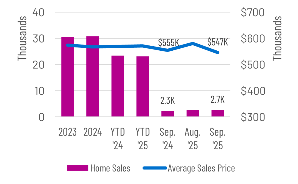- September regional home sales totaled 2,677, up 16.2% from 2,303 in Sep. 2024. The average home price in September 2025 dropped to $547K from $555K during the same time last year.