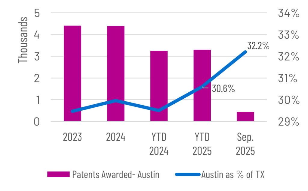 Austin inventors are averaging an impressive 4,500 patents awarded each year during the 2020’s, which is higher than the 3,750 averaged during the 2010’s. Patent activity in Sep. 2025 increased to 443 from 332 during the same month last year. Patent activity YTD is up 1.7% to 3,306 in 2025.