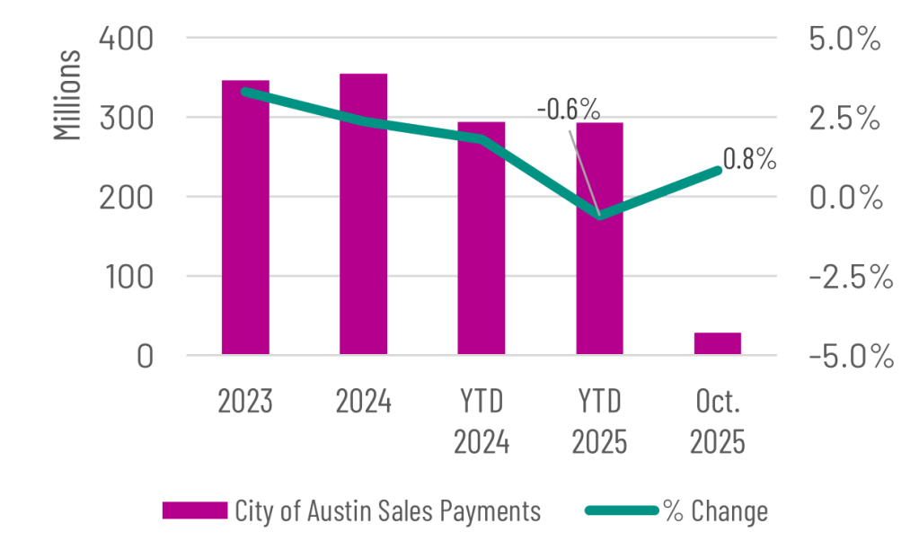 Sales tax allocation payments to the City of Austin grew 3.3% in 2023 and 2.4% in 2024. So far year to date through October 2025, receipts are down by 0.6% compared to the same time last year. Payments to Austin were $28.5M in October 2025, up 0.8% from the same month last year.