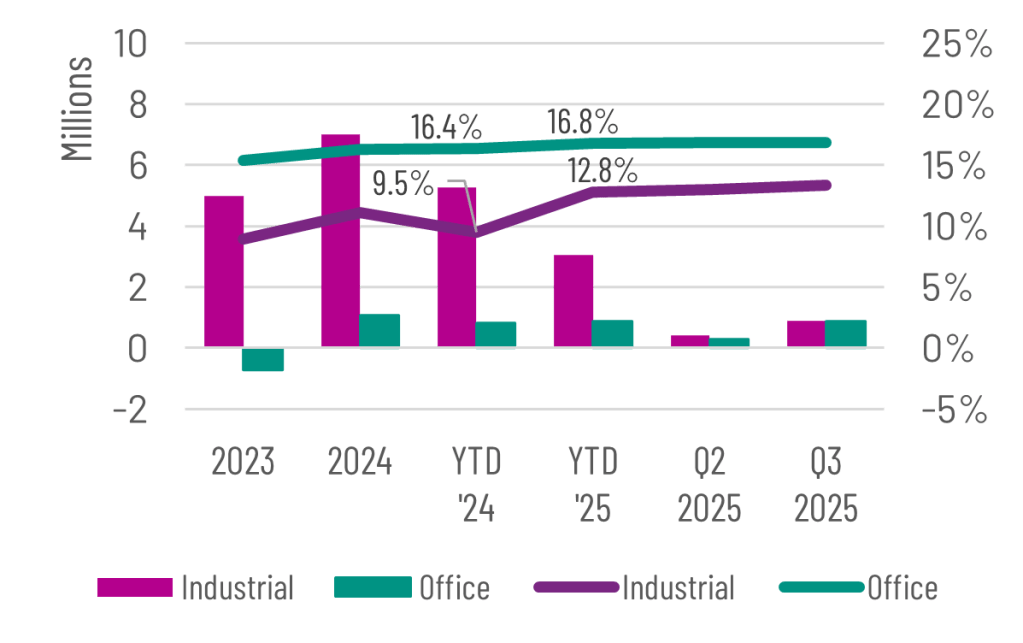 Likewise, the Austin industrial market has grown to 173M SF, adding 58M SF since 2020 Q2 or 51% growth over 5 years. YTD vacancy rate in 2025 at 12.8% is up from 9.5% in 2024. Quoted rates ticked up slightly to $15.07 in 2025 Q3.
