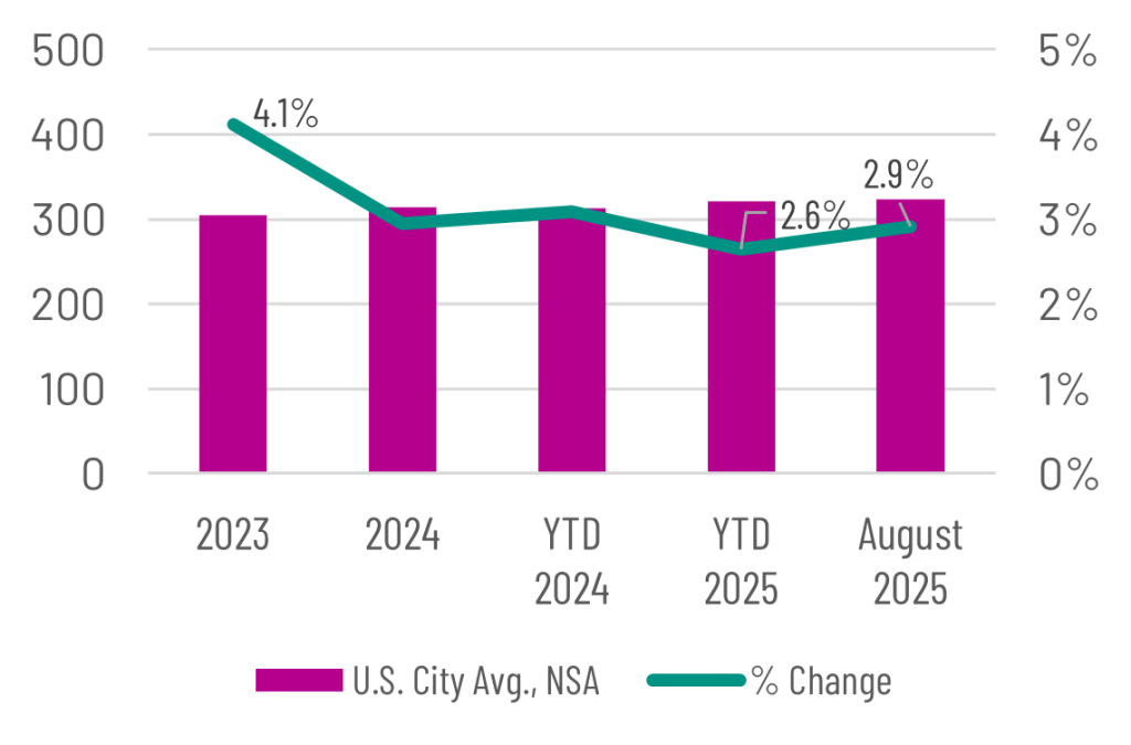 After reaching a 40-year high of 8.0% in the annual percent change in 2022, the U.S. Consumer Price Index fell to 4.1% in 2023 and 2.9% in 2024. Year over Year change in August 2025 was 2.9%, slightly higher than the 2025 YTD increase of 2.6%.