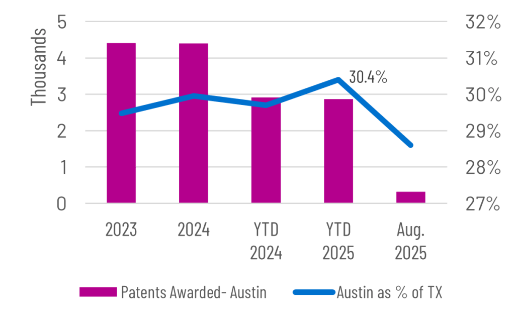 Austin inventors are averaging an impressive 4,500 patents awarded each year during the 2020’s, which is higher than the 3,750 averaged during the 2010’s. Patent activity in August 2025 increased to 320 from 280 during the same month last year. However, YTD patent activity is down 1.9% to 2,863 in 2025.