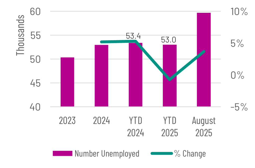 In August 2025, the number unemployed totaled 59,700, which is 2,100 more people than August 2024 when the total unemployed was 57,600. TX has 43,500 more unemployed compared to this time last year, while the US had 332,000 more unemployed.