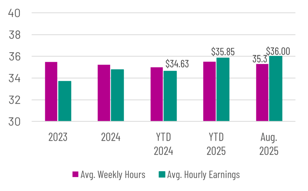 The average number of hours worked for payroll jobs in the Austin region in August 2025 was 35.3, down from 35.6 this time last year. For 2025 YTD, hours worked is up 1.5% from 2024 YTD. Texas employees also worked more hours this year, compared to last; however, for the US the avg. was unchanged.